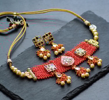 Explore our stunning collection, featuring oxidized jewelry with vintage charm, Kundan pieces showcasing intricate artistry, American diamond creations that sparkle with elegance, and beautifully crafted glass beads and stones transformed into unique accessories. Our collection also includes clutches and bags that perfectly complement your jewelry, adding sophistication and flair to your look.