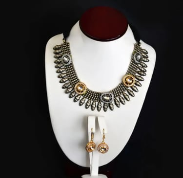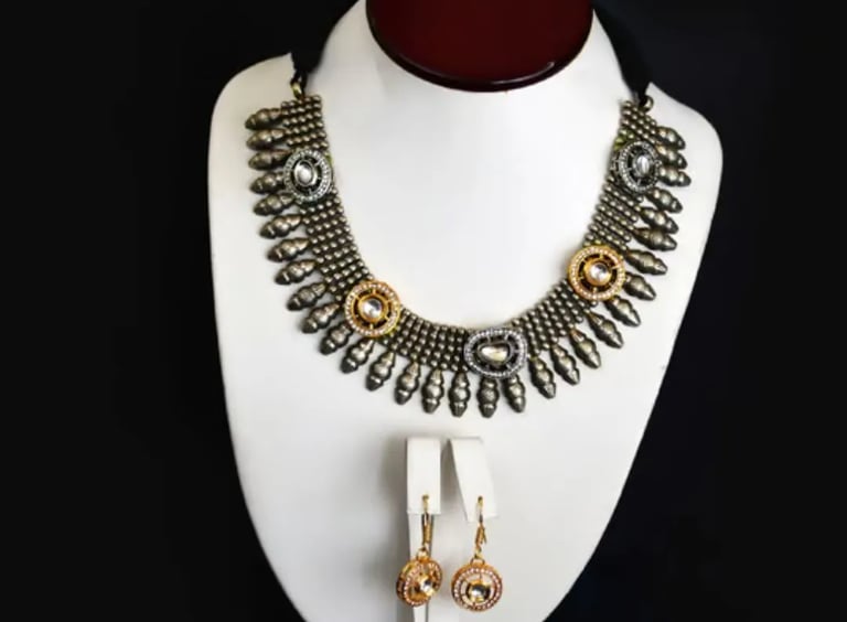 The store offers a wide array of necklace sets, including chokers, layered pieces, and full bridal sets. Many feature 18K gold plating and imitation kundan, polki, or American diamonds for that regal finish.
