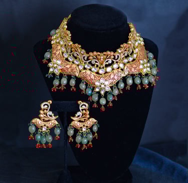 Kundan jewellery isn’t just about precious stones and metal – it’s a form of art that dates back to the royal courts of Rajasthan and Gujarat. The word "Kundan" itself means pure gold. The jewellery is crafted by embedding gemstones—like rubies, emeralds, sapphires, and uncut diamonds—into pure gold or silver foils, giving it a luxurious, layered effect.